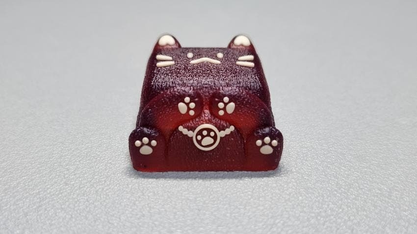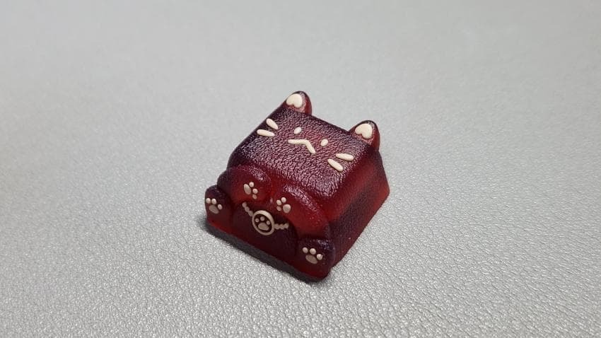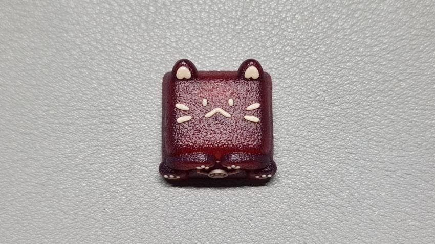 PBT fans의 pyga 키캡과 같이 불투명한 빨간색 몸통에 노란 크림 색상으로 이목구비가 이루어져 있습니다.
