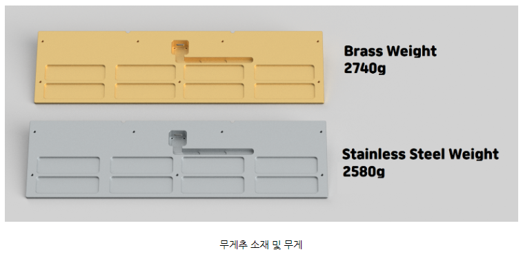 황동무게추는 2740g, 스테인레스 무게추는 2580g의 무게를 가지고 있습니다.