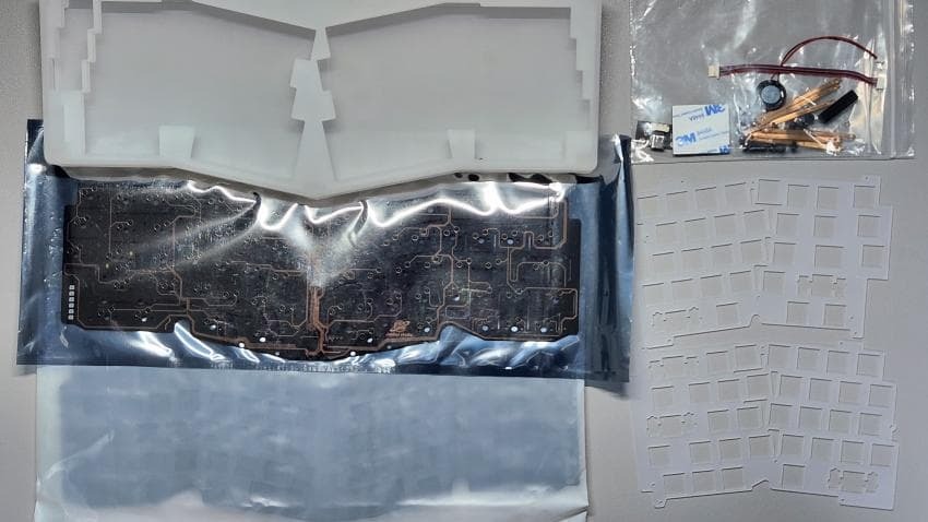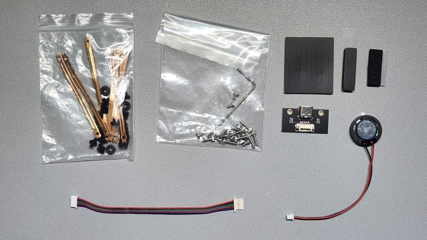 구성품은 하우징, PCB, PC Plate, 폼, 도터보드, JST케이블, 범폰, 리프 스프링, 렌치, 나사, 스피커 등이 있습니다.