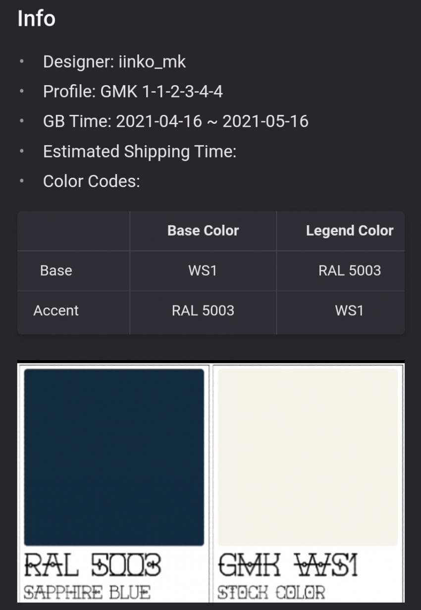 컬러 코드는 GMK WS1과 RAL 5003로 화이트와 네이비 색상의 조합니다.