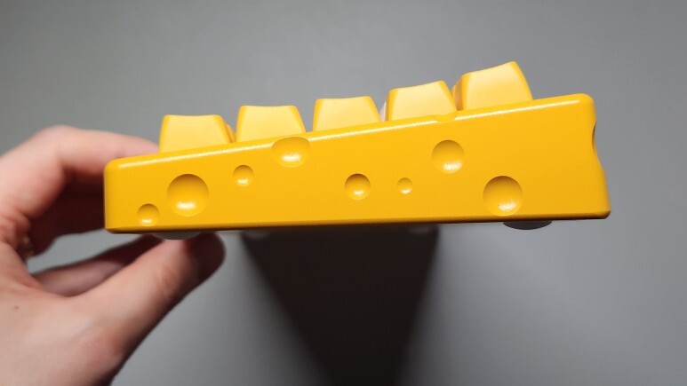 치즈와 같은 진한 노란색 색상에 하우징 곳곳에 치즈 덩어리와 같은 둥근 구멍자국이 파여있습니다.