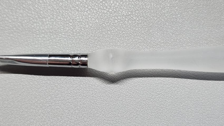 이전 붓들과 동일한 형태의 그립을 가지고 있고, 끝에는 투명한 빨대로 붓을 보호하고 있습니다.