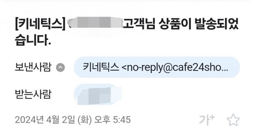 몇일 전 키네틱스에서 제품이 발송했다는 메일이 왔습니다.