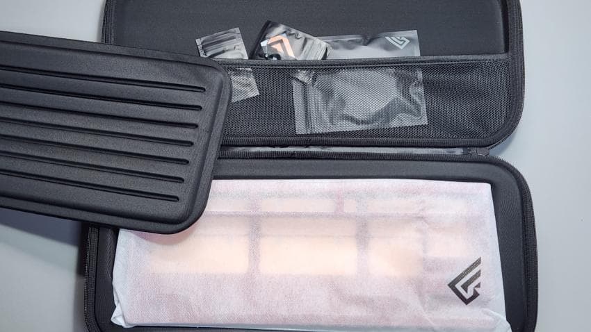 가방을 열면 상단 그물망에는 구성품들이, 하단에는 키보드가 있습니다.
