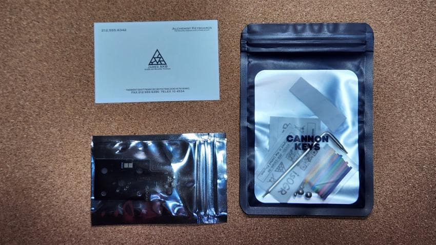 구성품에는 명함과 PCB, 범폰, 렌치, 스티커, 나사, 구슬, 색연필(?)이 들어있습니다.