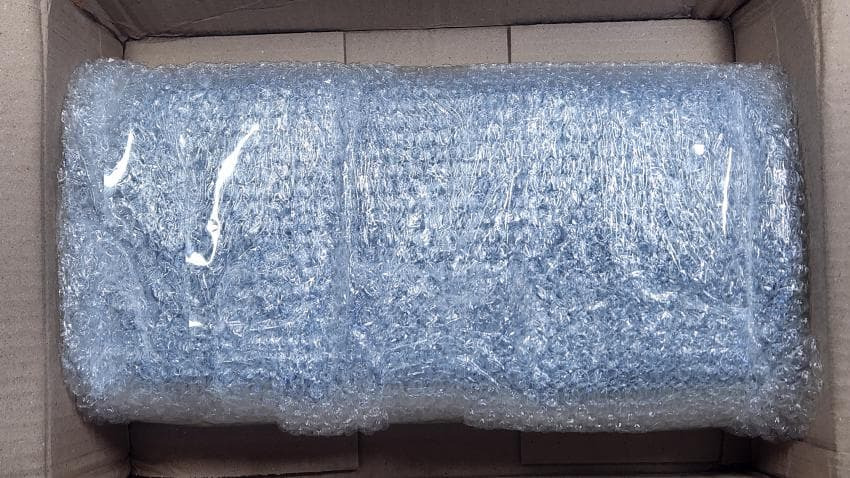 큰 박스에 뽁뽁이에 감긴 가방이 들어 있습니다.