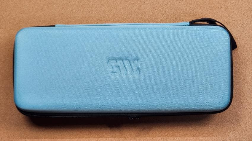 패키징은 하늘색 색상의 가방에 담겨있습니다. 가방에는 끈 형태의 손잡이가 달려있고, 가운데에는 크게 SW가 음각형태로 되어있습니다.