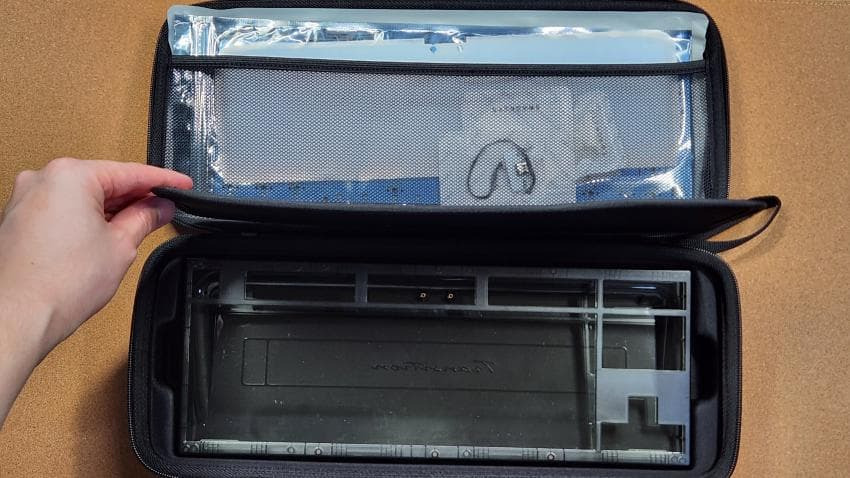 가방을 열면 아래에는 하우징, 위 그물망에는 구성품들이 들어있습니다.