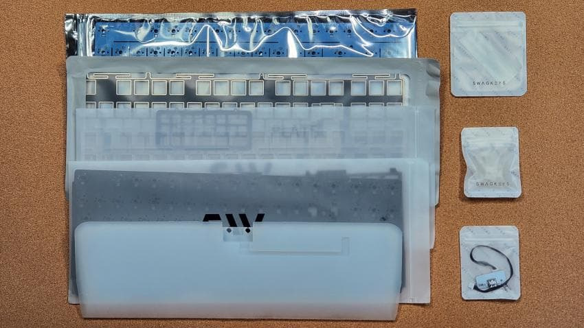 PCB, 보강판, 폼, 하부 실리콘, 범폰, 양말가스켓, 도터보드 및 나사가 들어있습니다.