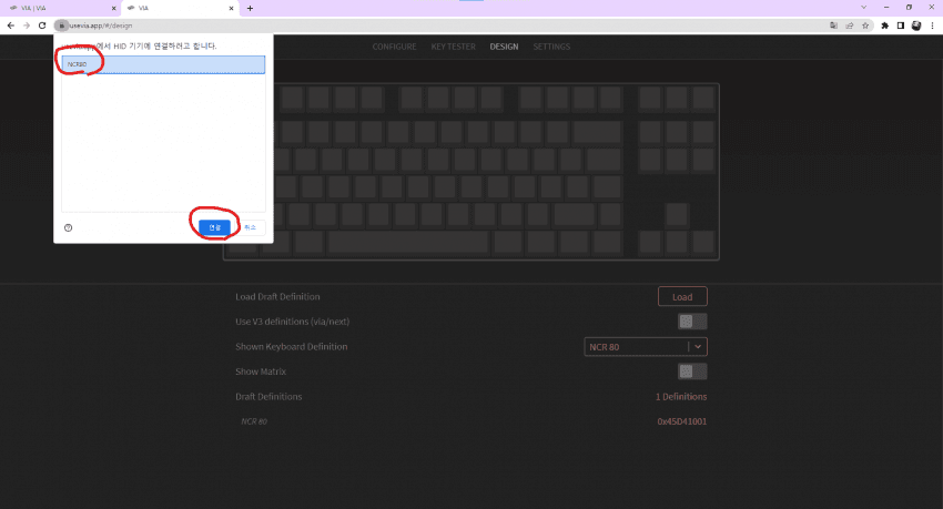 대다수의 via를 지원하는 키보드들은 키보드 이름을 클릭 후 연결을 누르시면 맵핑 페이지가 뜰겁니다.