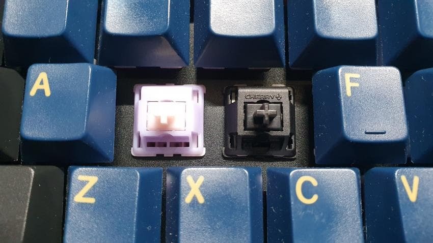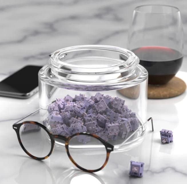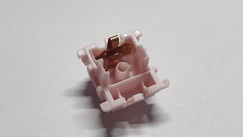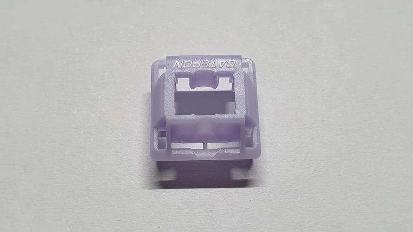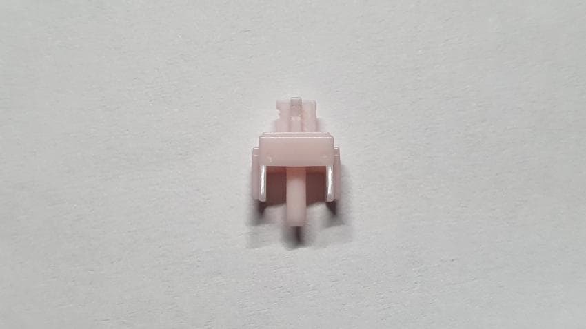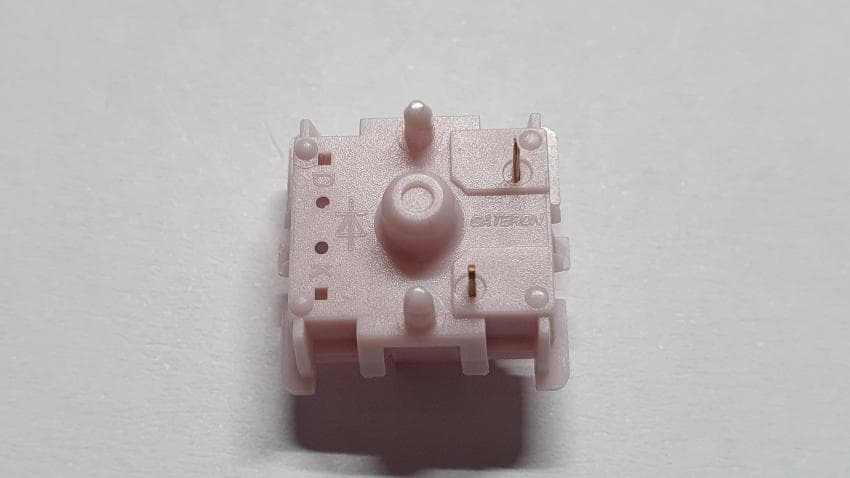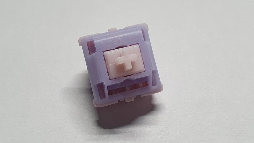 스위치의 외형을 살펴보면 라벤더 색상의 상부에 핑크색의 스템과 하부하우징을 가지고 있습니다.