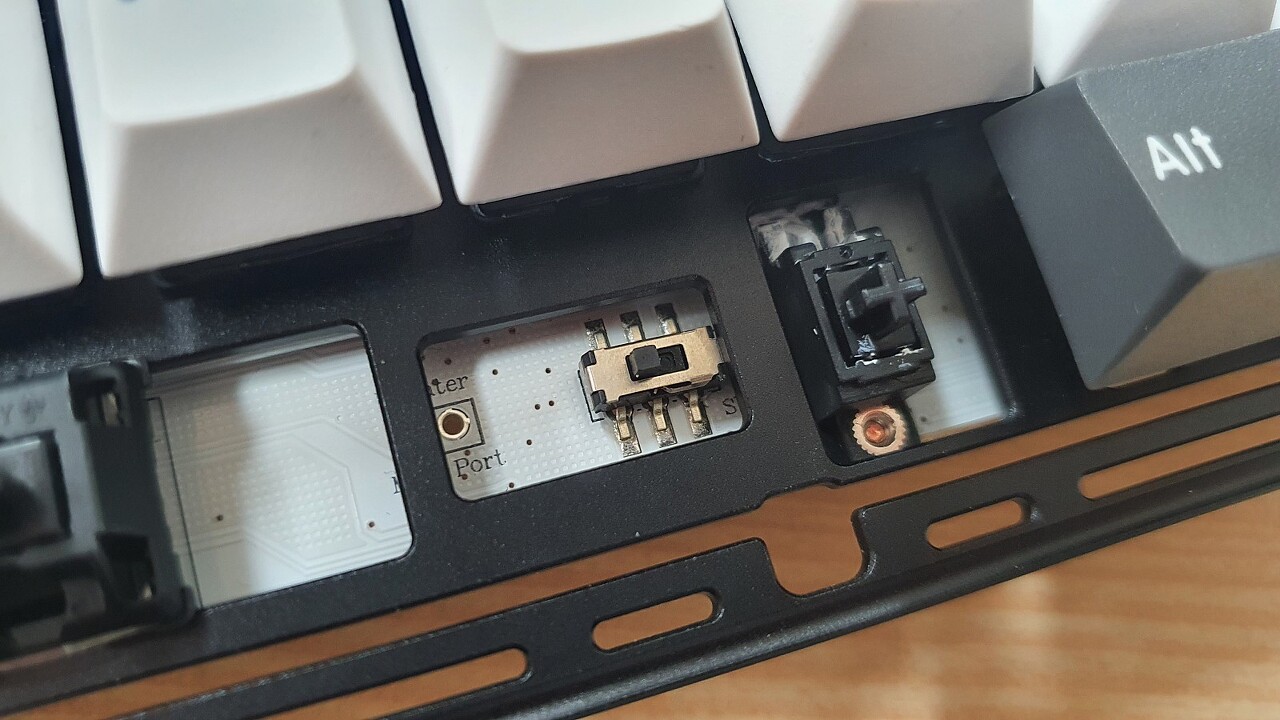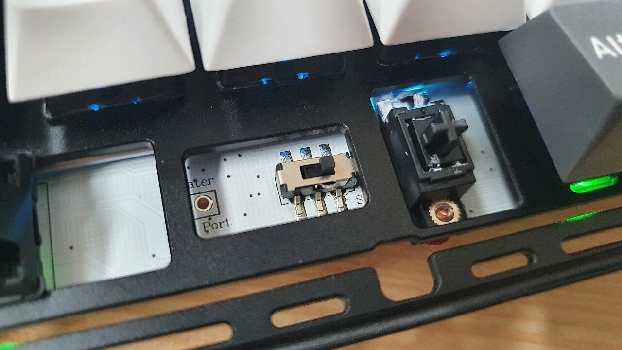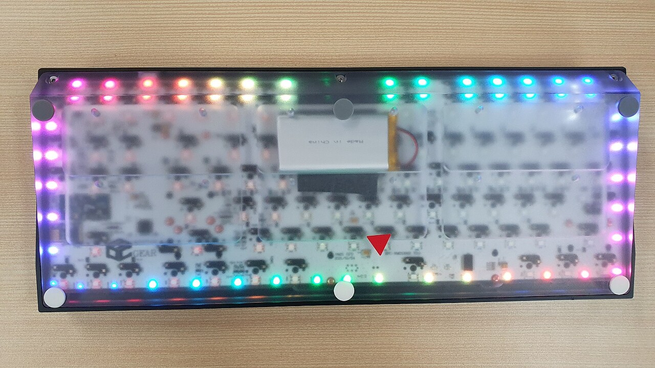 스페이스바 밑을 보시면 스위쳐가 있는데 왼쪽에 있던 것을 오른쪽으로 바꿔주시면 무선모드로 변경이 되며 기판에 불이 들어오기 시작합니다.
