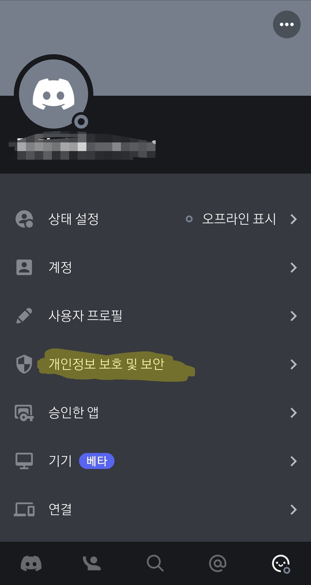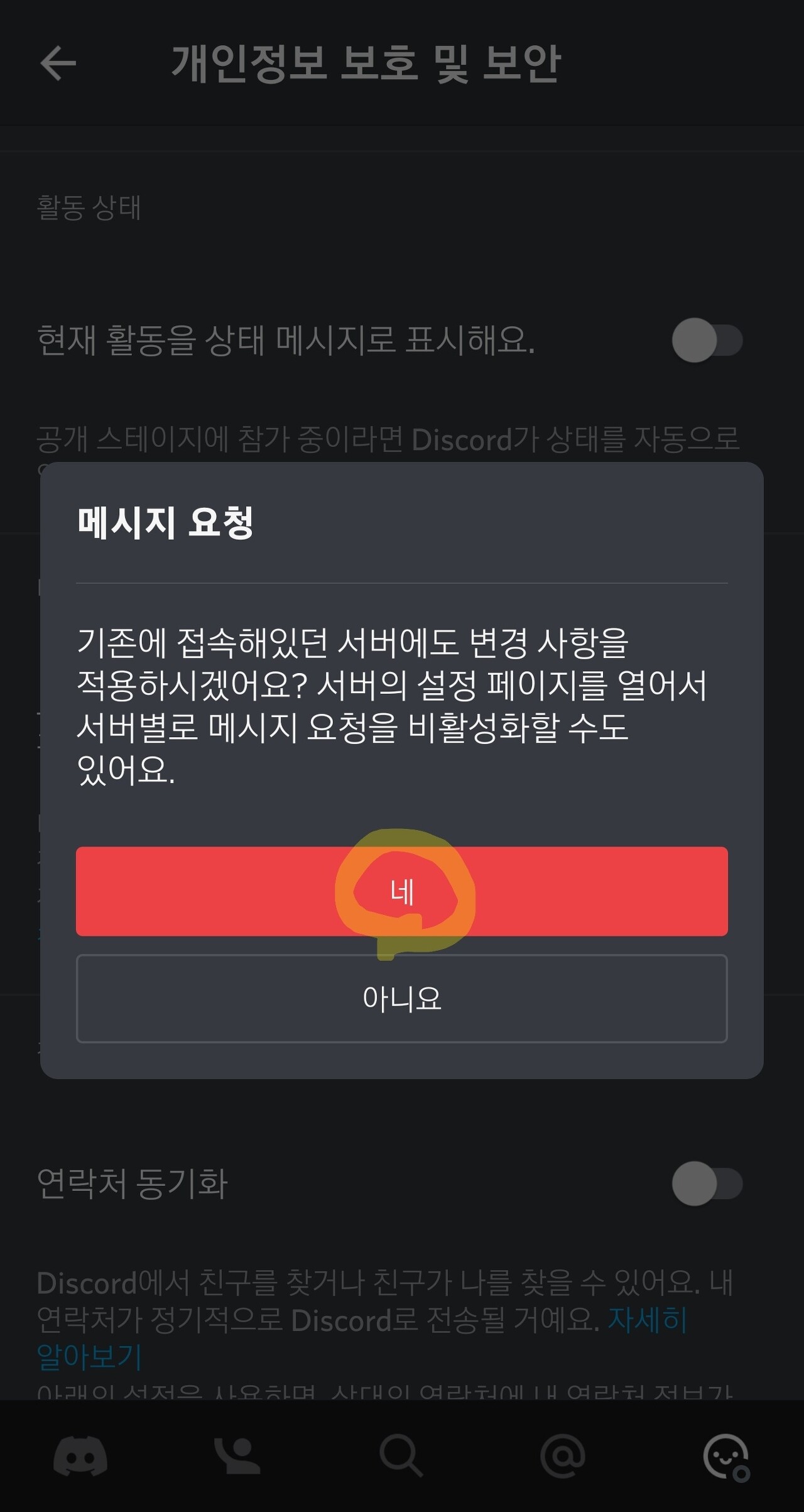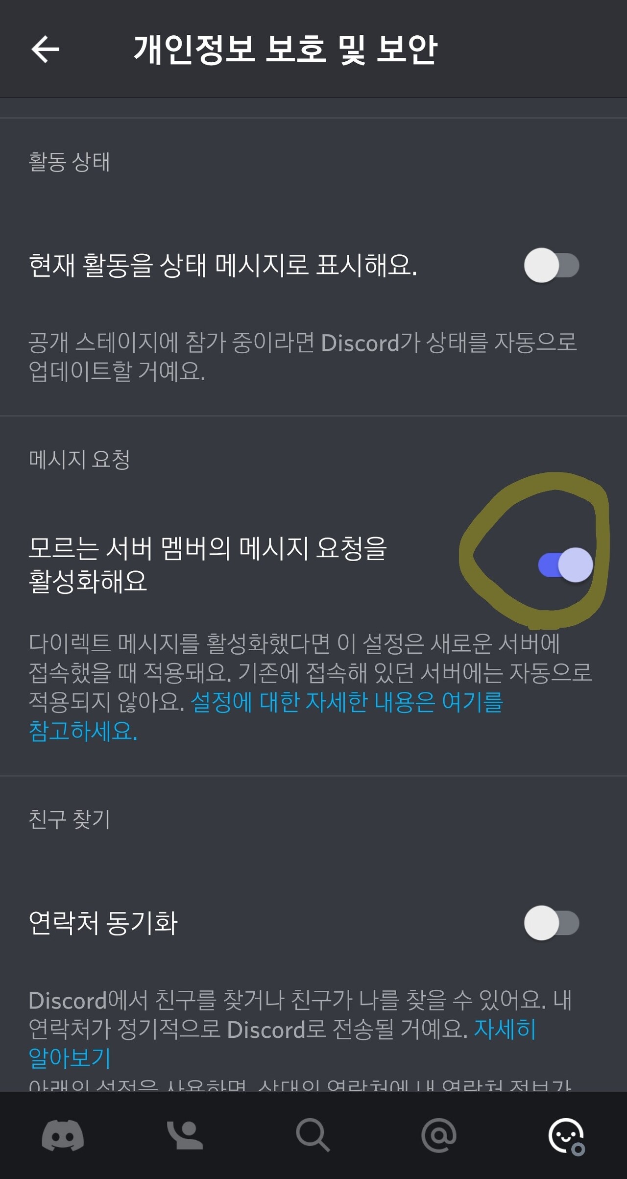 3. 아래로 내려보면 '메시지 요청' 탭에서 '모르는 서버 맴버의 메시지 요청을 활성화해요'를 클릭하여 비활성화 하시면 됩니다.