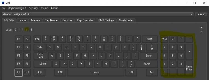 아래와 같이 평소에는 일반 TKL처럼 사용하다가, 넘락을 누르면 넘패드를 사용하게끔 설정했습니다.
