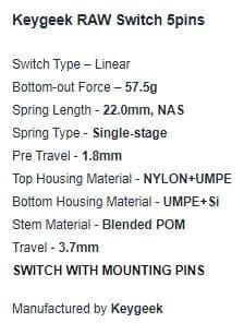 키압이 57.5g 으로 표기 되어있는데, 굉장히 긴 롱스프링으로 실제 타건 느낌은 62~63g 정도의 느낌을 줍니다.